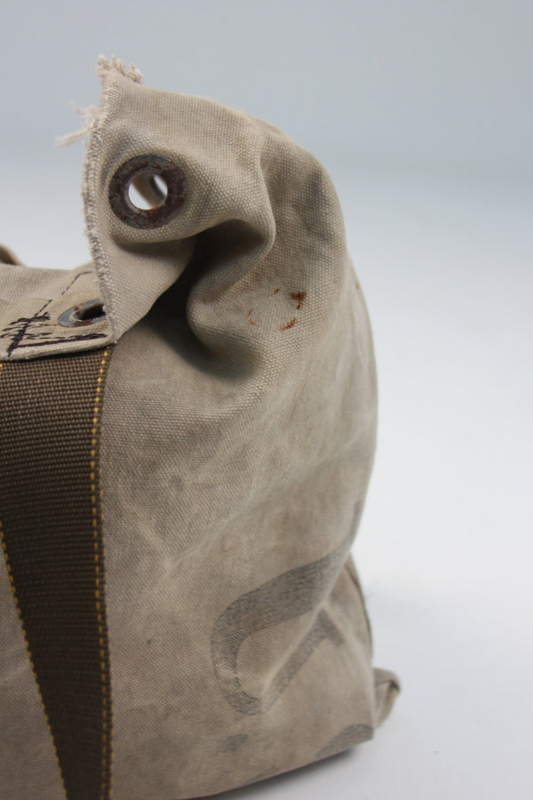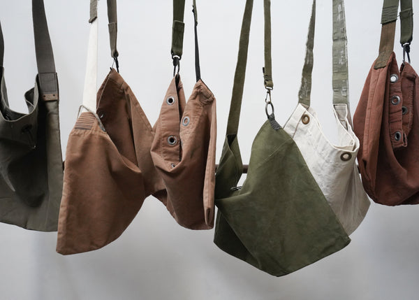 Military canvases, vintage postal bags, and sustainable fabrics are stitched together to bring new forms and shapes to forgotten materials.